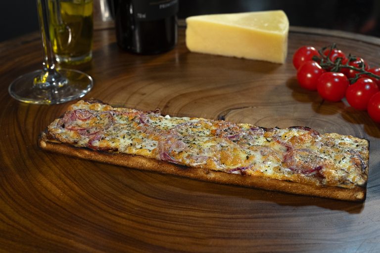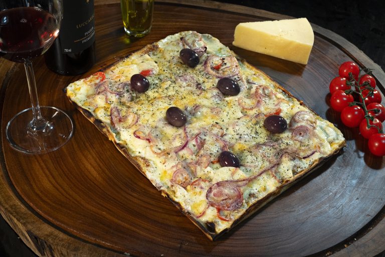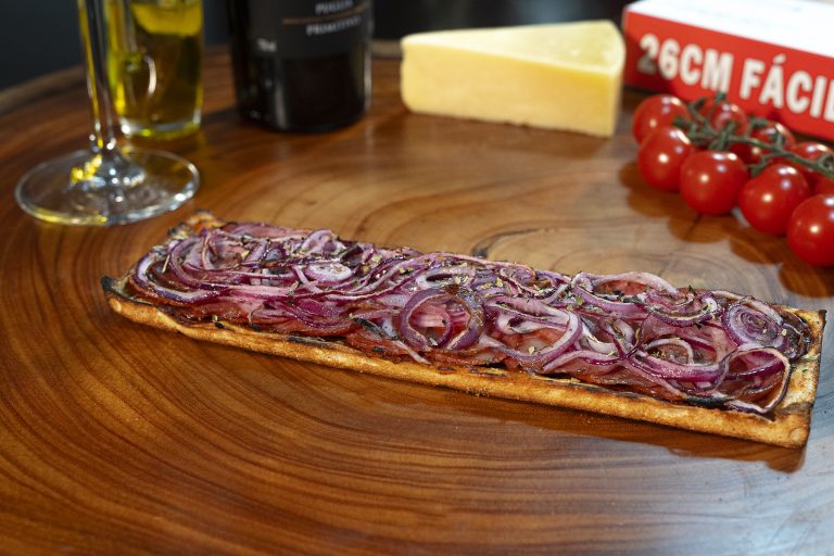 BACON: Mussarela, Base por Baixo de Requeijão Mega Cremoso, Tomate Cereja, Cebola Roxa, Azeitonas Pretas Azapa e Orégano.
