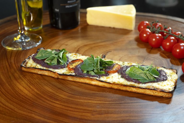 Mussarela de Búfala, Pesto de Azeitonas, Manjericão, Tomate Cereja, Azeitonas Pretas Azapa e Orégano.