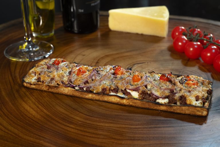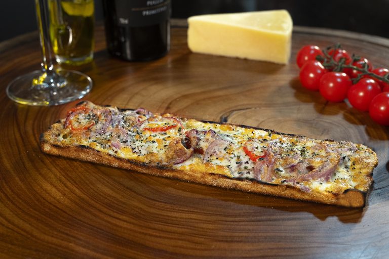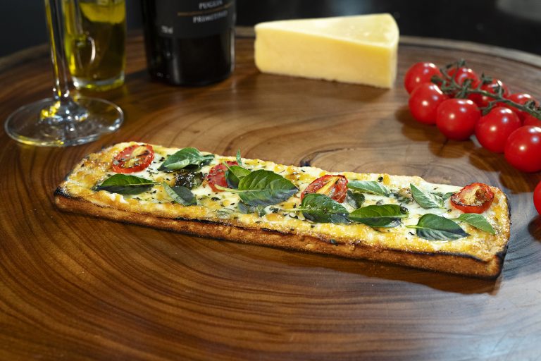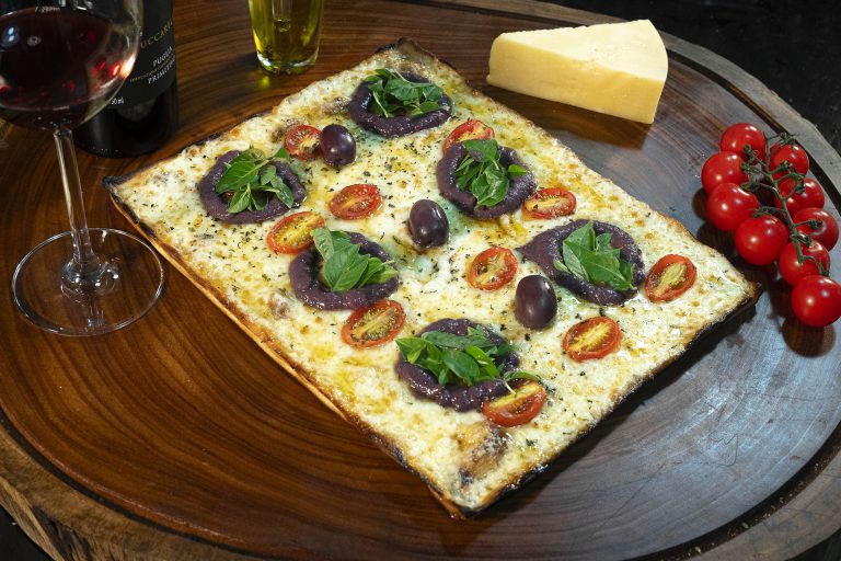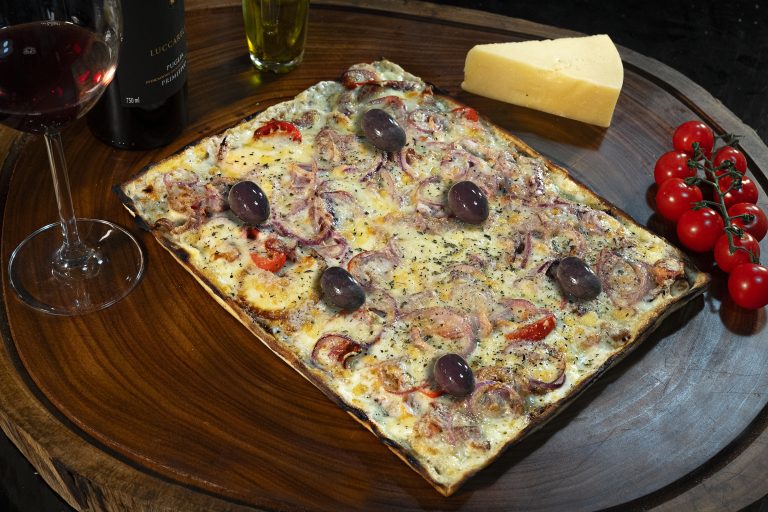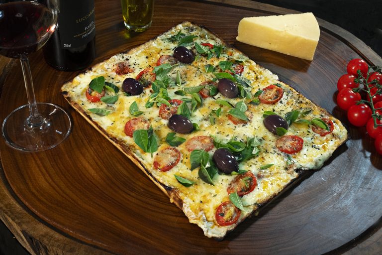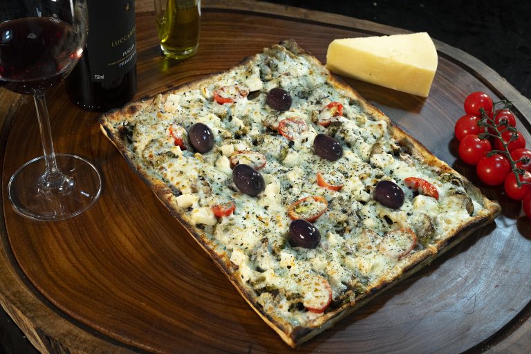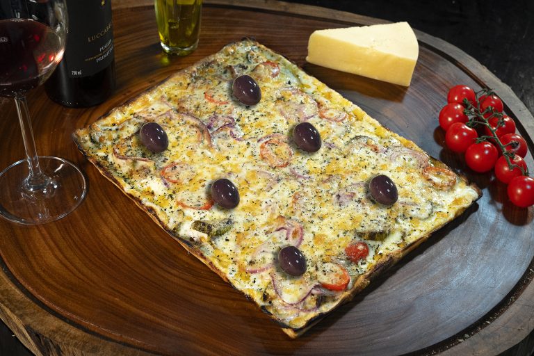 ABOBRINHA: Abobrinha, Mussarela, Base por Baixo de Requeijão Mega Cremoso, Tomate Cereja, Cebola Roxa, Azeitonas Pretas Azapa e Orégano.