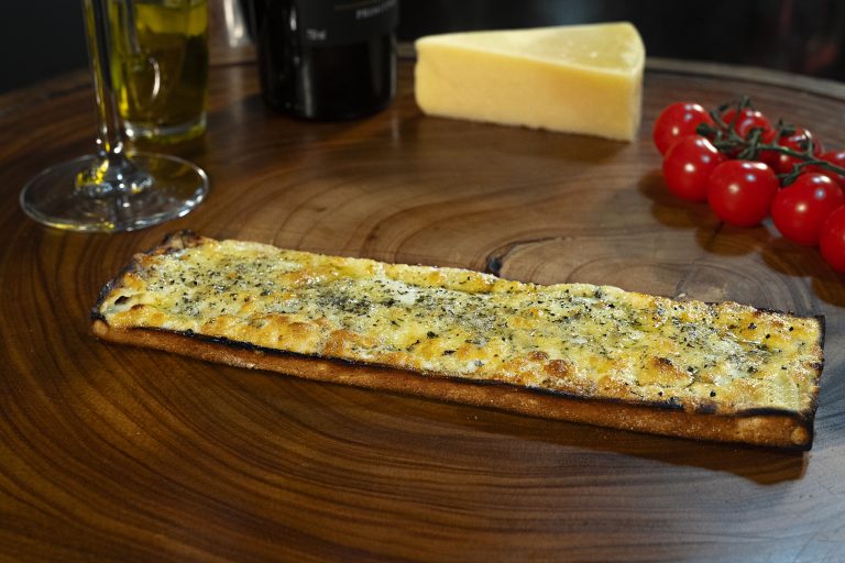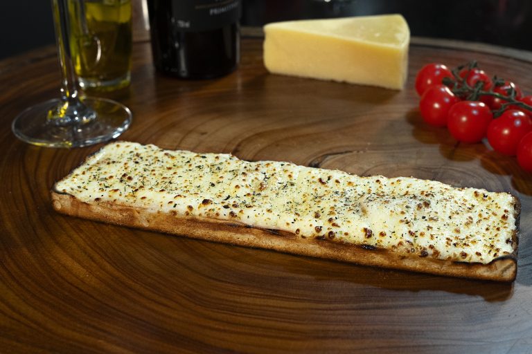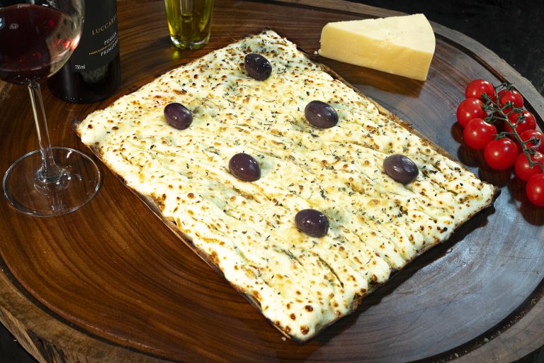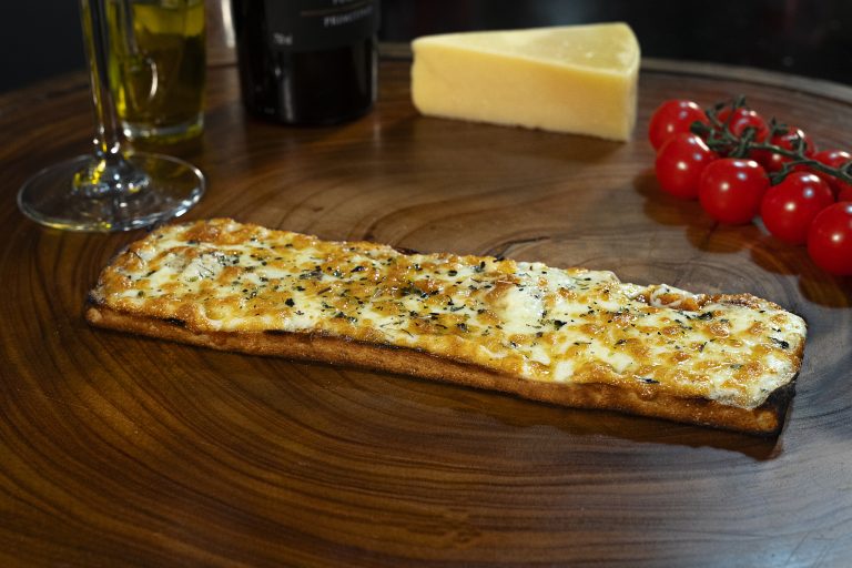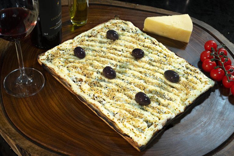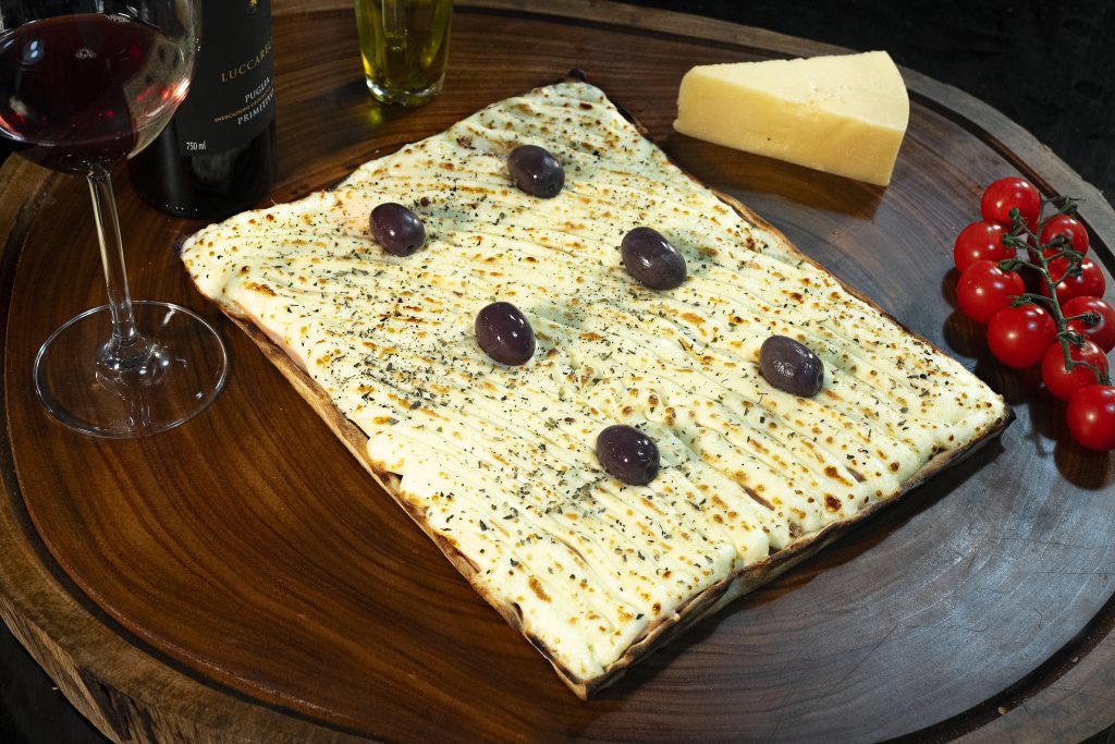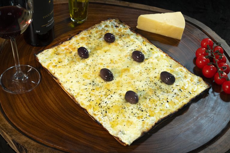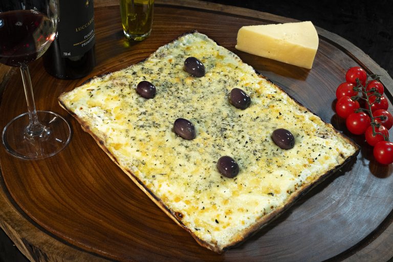 Base por Baixo de Requeijão Mega Cremoso, Mussarela, Gorgonzola, Provolone, Azeitonas Pretas Azapa e Orégano.