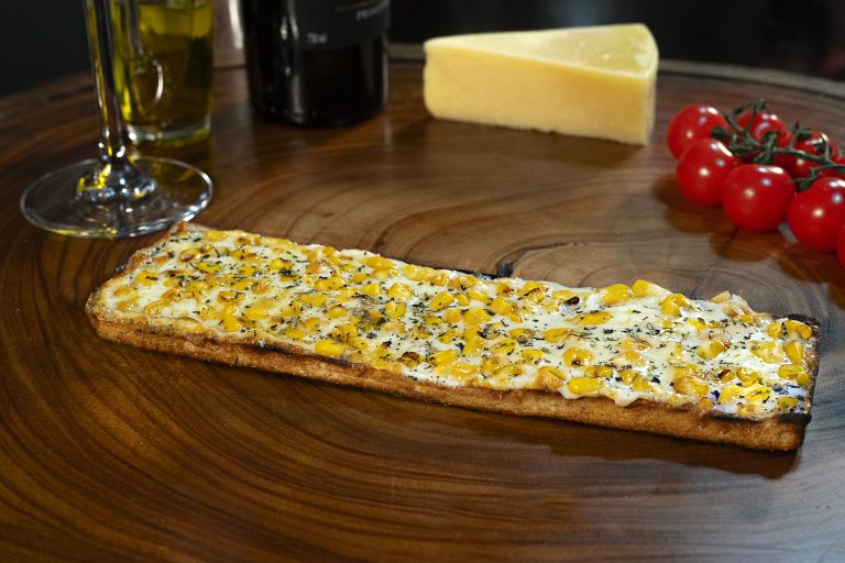 Milho, Mussarela, Base por Baixo de Requeijão Mega Cremoso, Tomate Cereja e Orégano.
