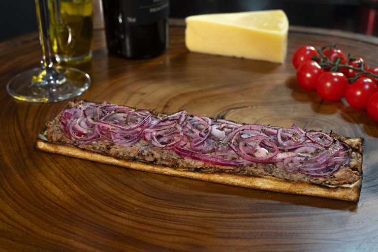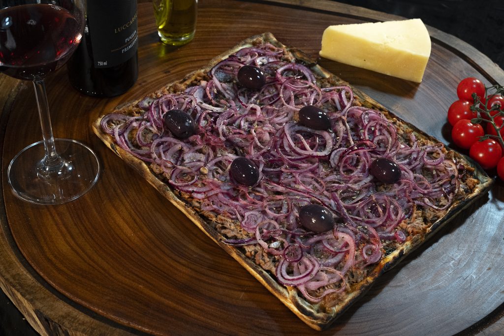Atum, Base por Baixo de Requeijão Mega Cremoso, Cebola Roxa, Azeitonas Pretas Azapa e Orégano.
