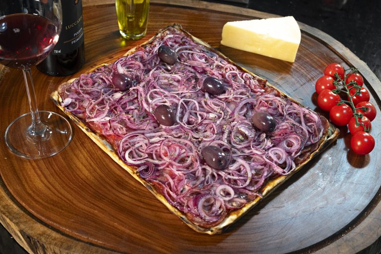 Fatias De Calabresa Especial, Cebola Roxa, Azeitonas Pretas Azapa e Orégano.