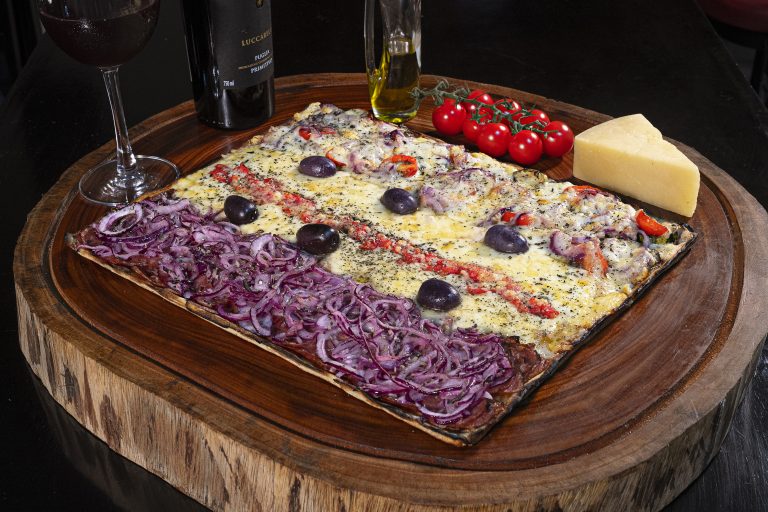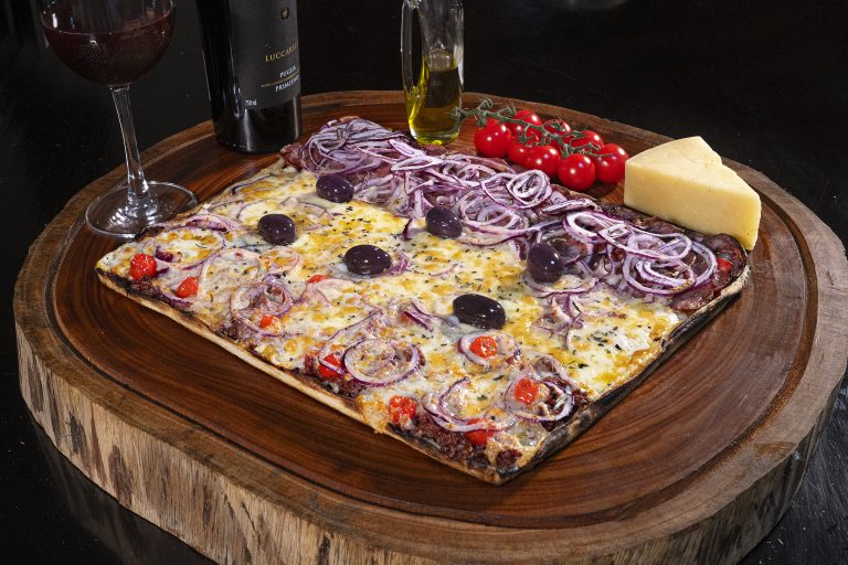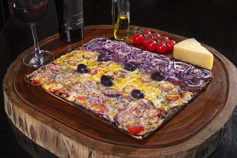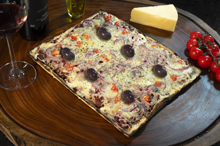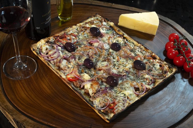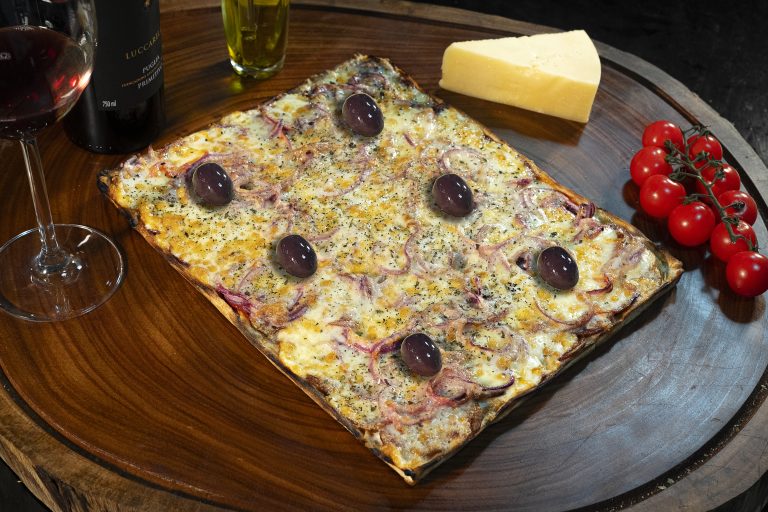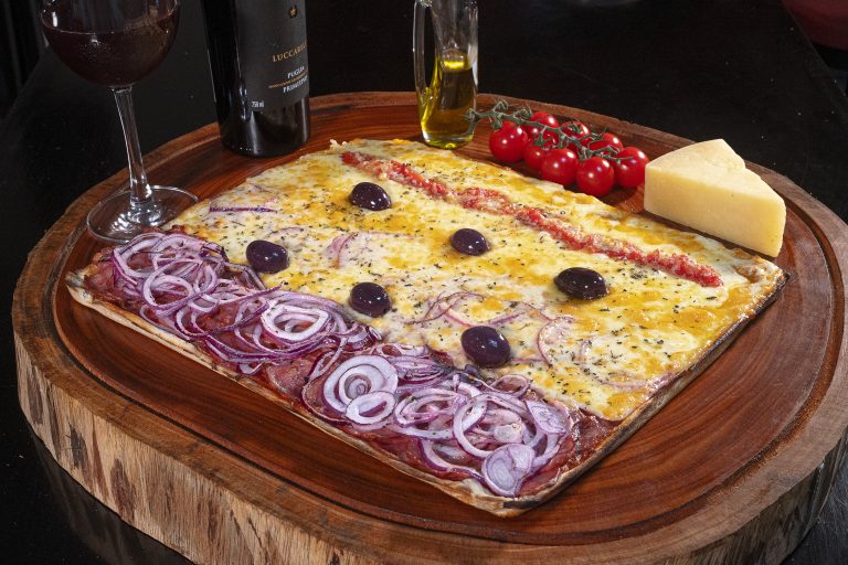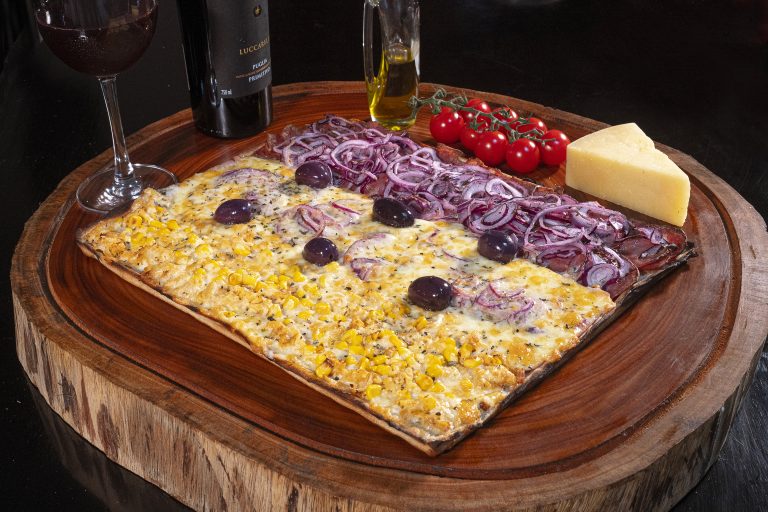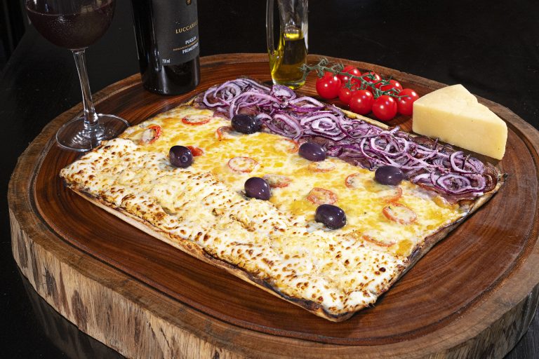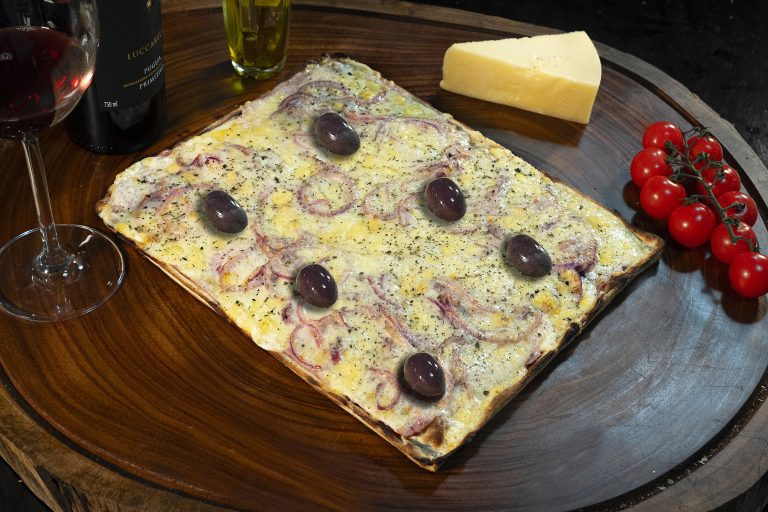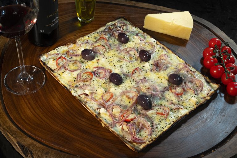 LOMBO: Lombo, Cebola, Base por Baixo de Requeijão Mega Cremoso, Azeitonas Pretas Azapa e Orégano.