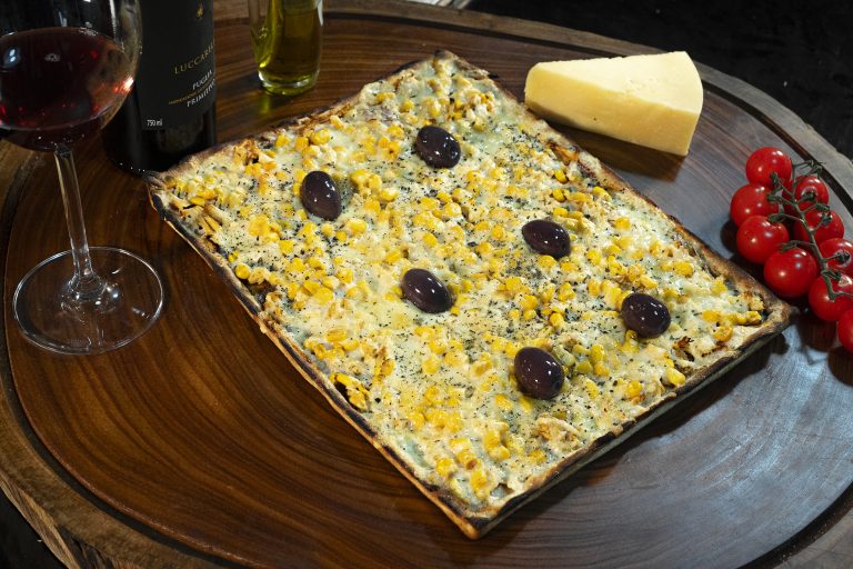Milho, Mussarela, Base por Baixo de Requeijão Mega Cremoso, Tomate Cereja, Azeitonas Pretas Azapa e Orégano.