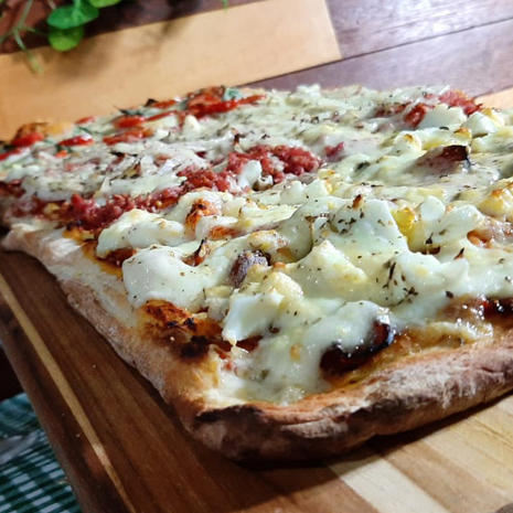 Calabresa Moída, Mussarela, Base por Baixo de Requeijão Mega Cremoso, Parmesão, Ovos, Pimenta, Pimenta biquinho, Cebola Roxa, Azeitonas Pretas Azapa e Orégano.