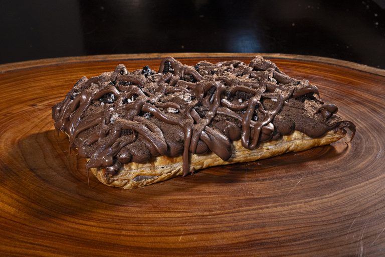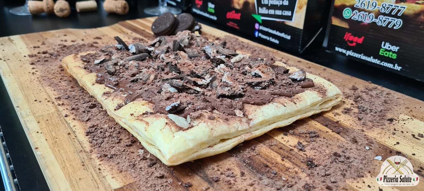 Massa Folhada com Chocolate ao Leite, Cobertura extra de Ovomaltine® e Biscoitos Negresco®.