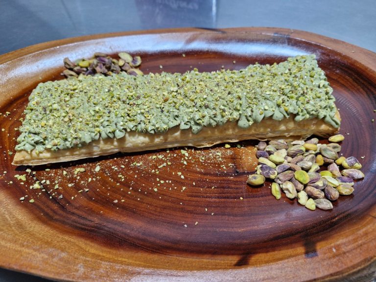 Massa Folhada com Delicioso Creme de Pistache Italiano e Pistache em Grãos Triturado por cima.